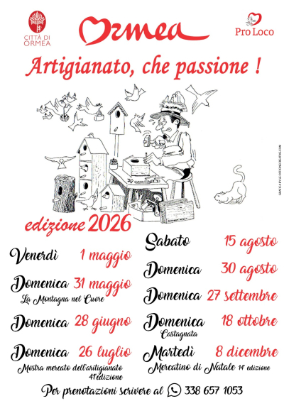 MERCATINI Periodo: 15/08/2026 Località: Ormea Nel cuore del centro storico di Ormea, tornano i Mercatini del Cuore dalle 9.00 alle 19.00. Data: 15 agosto Per partecipare scrivere a +39 338 657 1053 Informazioni Pro Loco Ormeaproloco.ormea@tiscali.it