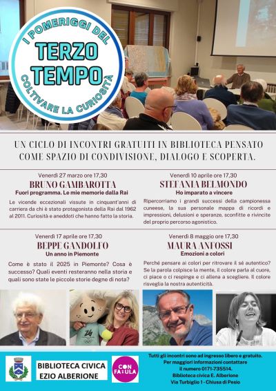 La Biblioteca Civica "Ezio Alberione" di Chiusa di Pesio propone “I Pomeriggi del Terzo Tempo – Coltivare la curiosità”, un ciclo di incontri gratuiti pensato come spazio di condivisione, dialogo e scoperta. L’iniziativa invita il pubblico a trascorrere insieme momenti di riflessione e approfondimento attraverso le storie e le esperienze di ospiti provenienti da ambiti diversi.