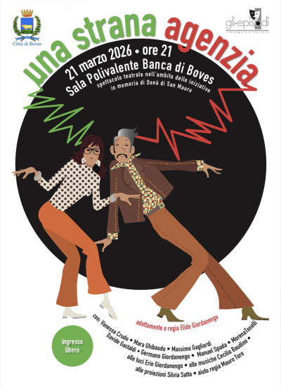 Sabato 21 marzo, alle ore 21,00 presso la Sala Polivalente "Banca di Boves" (già Teatro Don Bernardi), la compagnia teatrale "Gli Episodi" e la regista Elide Giordanengo propongono uno spettacolo teatrale tratto dall'opera "Una strana agenzia" di Donà di San Mauro nell'ambito delle iniziative in ricordo, a 50 anni dalla morte, del celebre autore di "Boves Kaput!". Evento libero e gratuito.