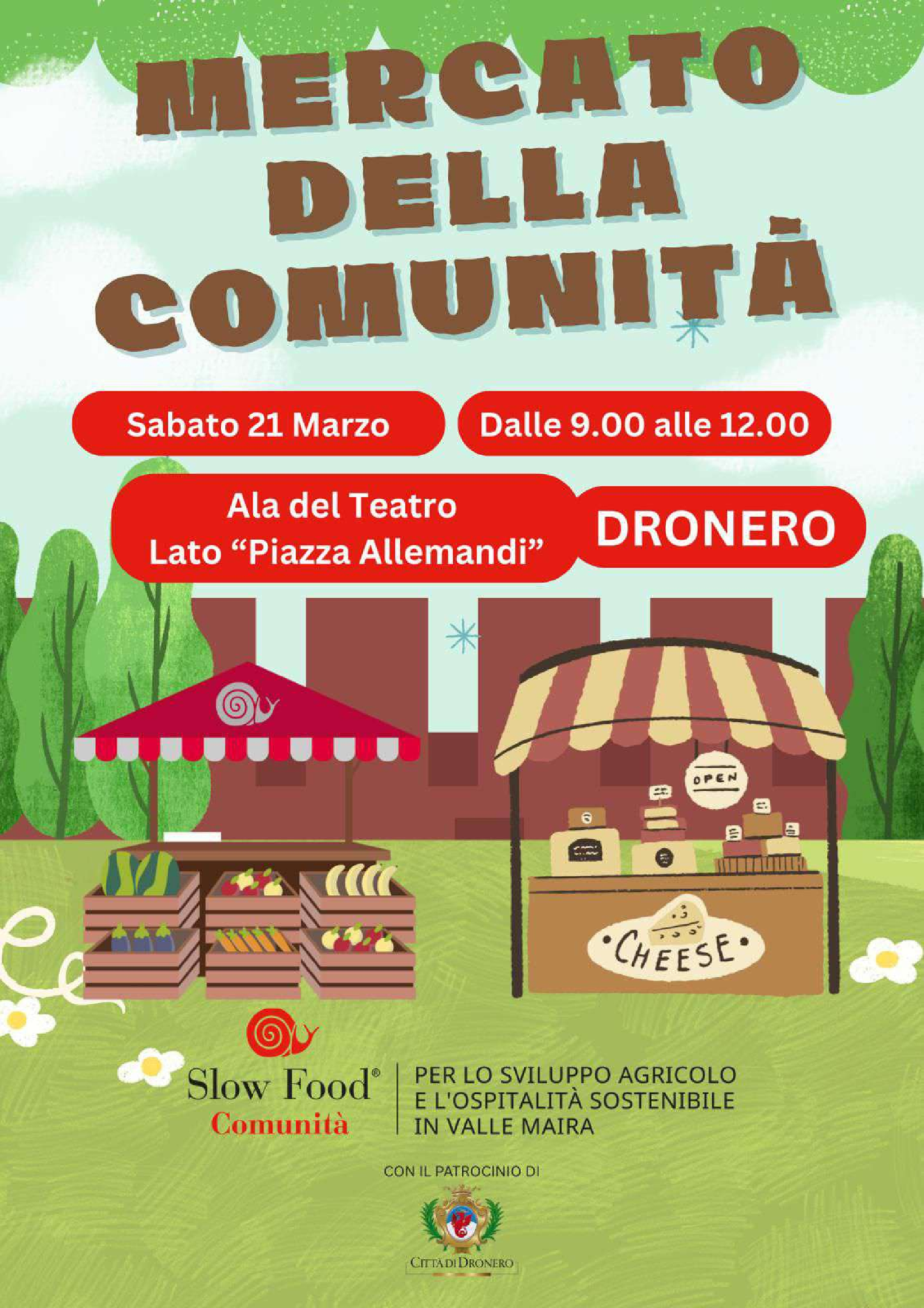 Sabato 21 marzo, dalle ore 9.00 alle 12.00, presso l'ala del teatro di Piazza Allemandi, Slow Food ed il Comune di Dronero organizzano il Mercato della Comunità, iniziativa che ha come scopo la valorizzazione dei prodotti del territorio e la promozione di uno sviluppo agricolo sostenibile in Valle Maira.