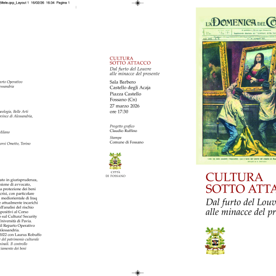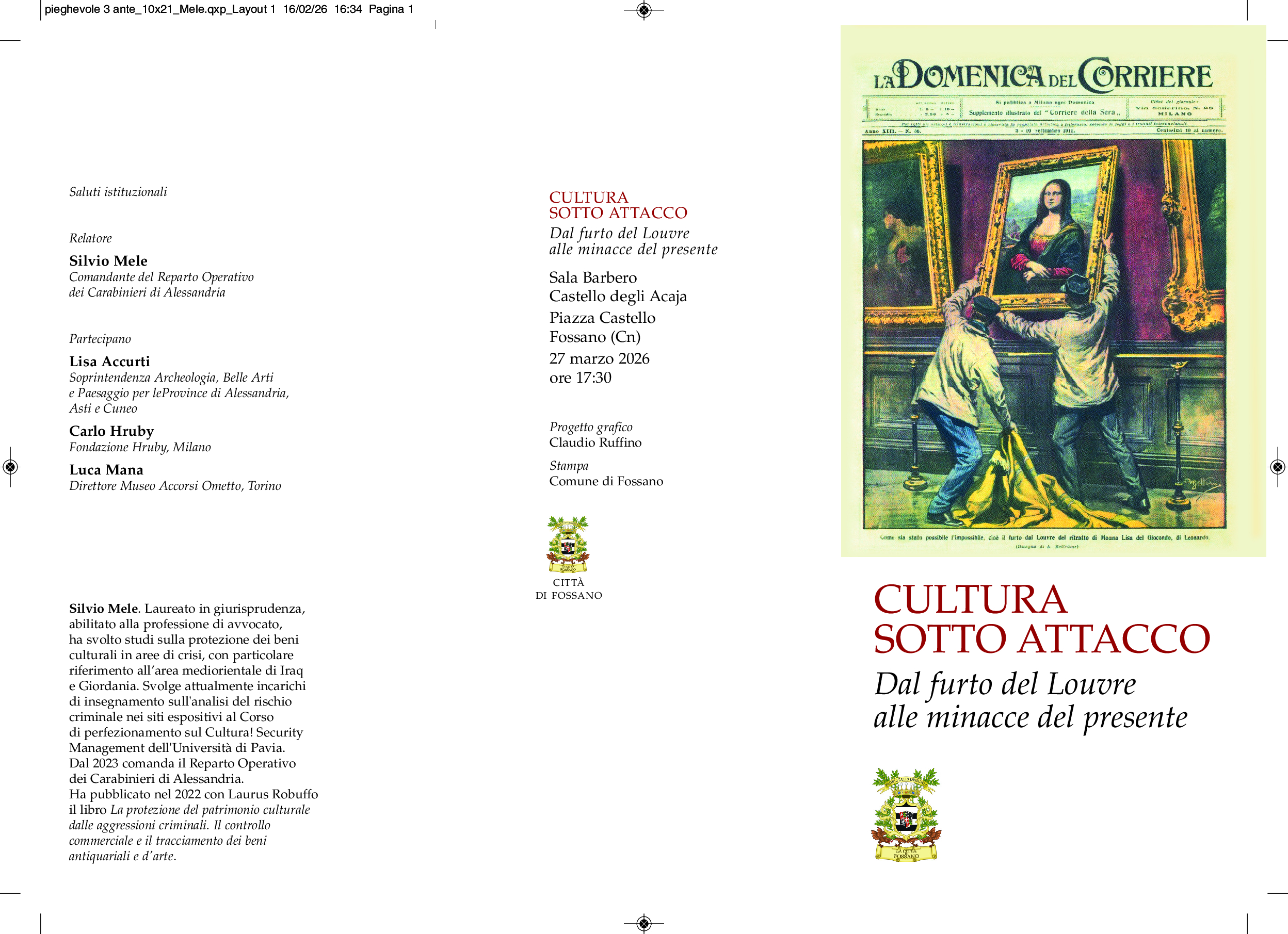 Venerdì 27 marzo alle ore 17.30, presso la Sala Barbero del Castello degli Acaia a Fossano, "Cultura sotto attacco: dal furto del Louvre alle minacce del presente". Convegno dedicato alla protezione del patrimonio artistico italiano. Relatore Silvio Mele, Comandante del Reparto Operativo dei Carabinieri di Alessandria. Partecipano Lisa Accurti (Sopraintendenza Archeologia Belle Arti), Carlo Hruby (Fondazione Hruby Milano) e Luca Mana (Direttore Museo Accorsi Ometto Milano). Ingresso gratuito.