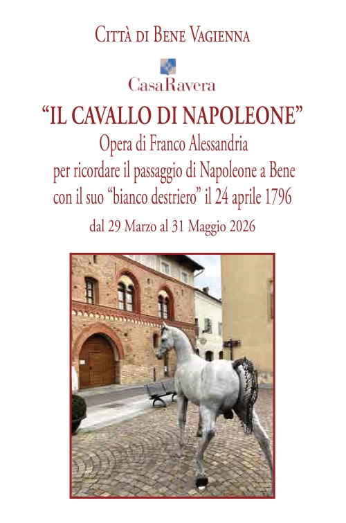 Dal 29 marzo al 31 maggio, a Bene Vagienna, la Piazzetta San Rocco ospita “Il cavallo di Napoleone”, opera realizzata dall’artista Franco Alessandria. L’evento è organizzato per ricordare il passaggio di Napoleone sul territorio, in sella al suo cavallo bianco, avvenuto il 24 aprile 1796.  Inaugurazione 29 marzo alle ore 11, oltre all’opera principale esposta in piazzetta, l'esposizione continua con altri lavori dell’artista collocati nel cortile d’onore di Casa Ravera (giorni festivi 10 - 12 / 15 - 18). Ingresso libero.