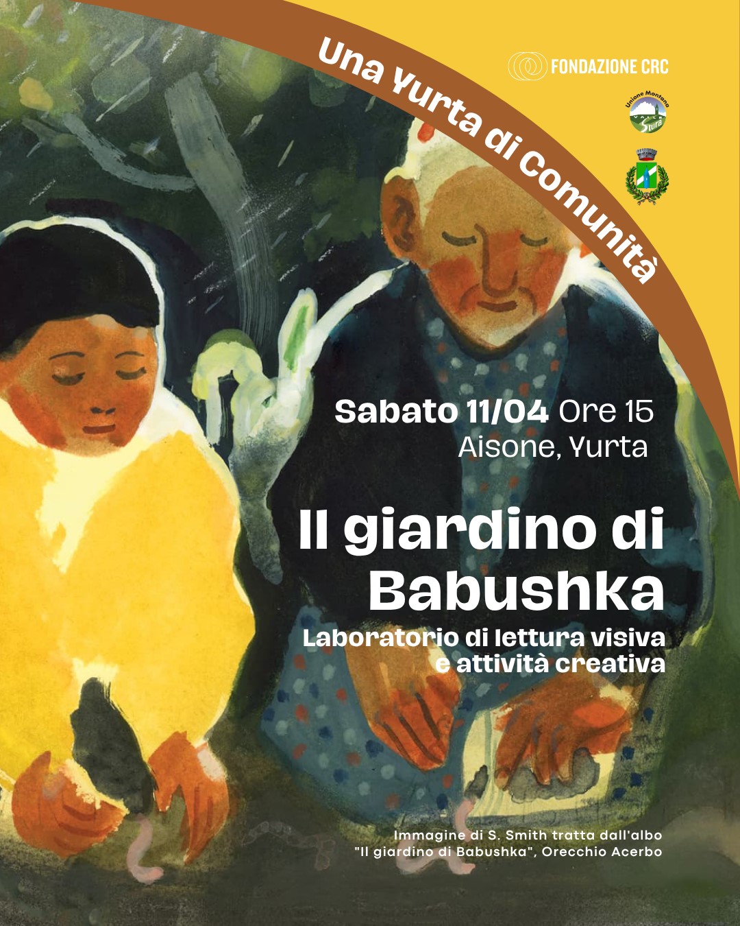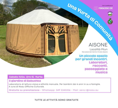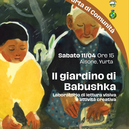 Sabato 11 aprile, alle ore 15,00 in località "Pilun" ad Aisone, in occasione della rassegna culturale "Una yurta di comunità" vi attende il laboratorio di lettura visiva e attività manuale "Il giardino di Babushka".