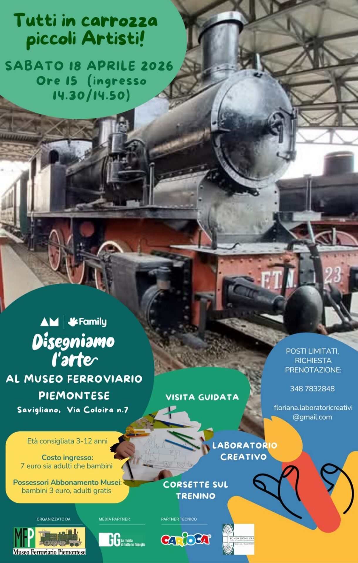 Sabato 18 aprile, alle ore 15.00, nell'ambito dell'iniziativa "Disegnamo l'arte" organizzata da Abbonamento Musei, il Museo Ferroviario Piemontese propone un intero pomeriggio dedicato ai bambini. Il costo d'ingresso è di 7 euro a persona, 3 euro per possessori di Abbonamento Musei.