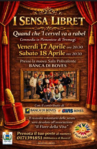Venerdì 17 e sabato 18 aprile, alle ore 20,30 presso la Sala Polivalente di Boves, "I sensa libret" presenteranno la commedia piemontese "Quand che 'l cervel va a rabel". Evento gratuito, prenotazione necessaria.