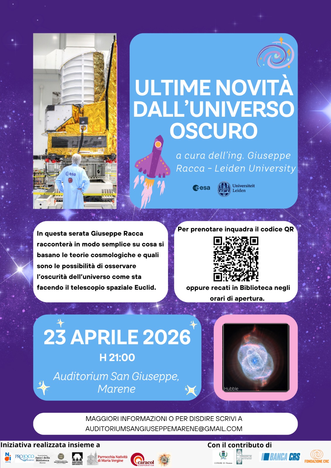 Giovedì 23 aprile, alle ore 21.00, l'Auditorium San Giuseppe di Marene organizza ed ospita "Ultime novità dall'universo oscuro", una serata di divulgazione scientifica con l'Ingegnere Giuseppe Racca. Ingresso libero, prenotazione obbligatoria.