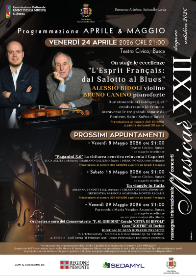 A maggio, la rassegna internazionale Musicaè, organizzata dall’Associazione Amici della Musica di Busca, prosegue dall'8 al 29 maggio con altri importanti appuntamenti a Busca prima della stagione estiva.