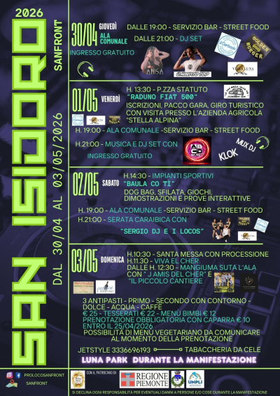 Da giovedì 30 aprile a domenica 3 maggio, Sanfront festeggia San Isidoro con quattro giornate ricche di appuntamenti: street food e musica ogni sera all'Ala Comunale (ingresso gratuito), raduno di Fiat 500, un evento dedicato ai cani, celebrazioni religiose e il tradizionale pranzo della domenica.