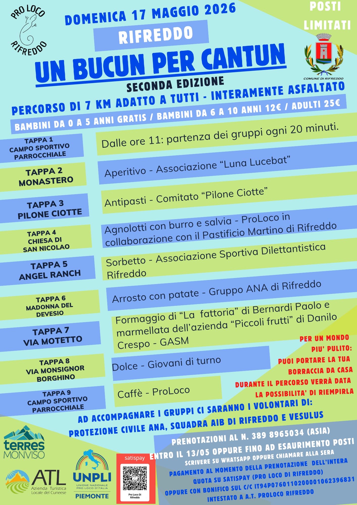 Domenica 17 maggio a Rifreddo si svolge la seconda edizione di “Un Bucun per Cantun”, camminata enogastronomica di circa 7 km lungo un percorso interamente asfaltato e adatto a tutti, con partenza e arrivo al campo sportivo parrocchiale. Partenze ogni 20 minuti dalle 11 alle 14. Prenotazione obbligatoria entro il 13 maggio ai contatti riportati di seguito.