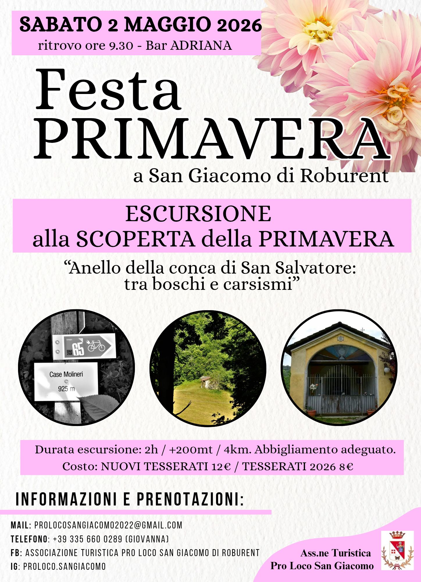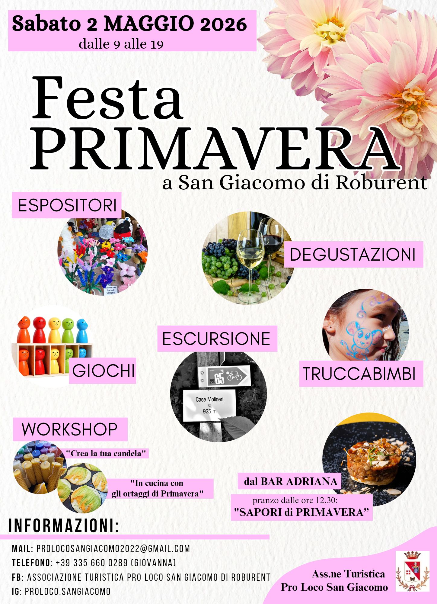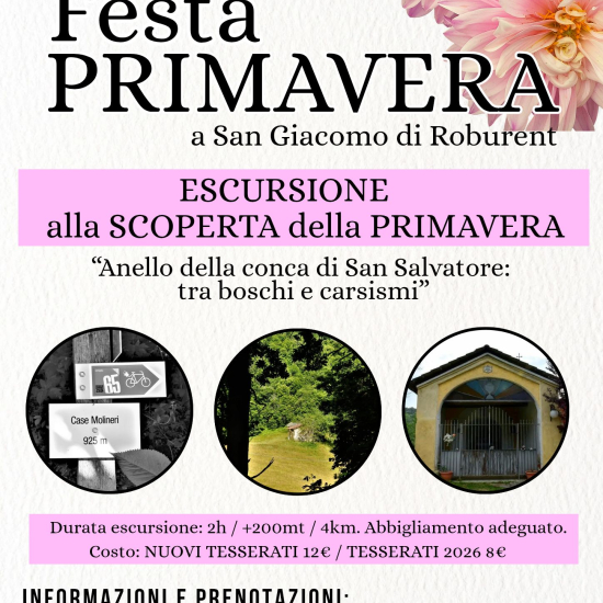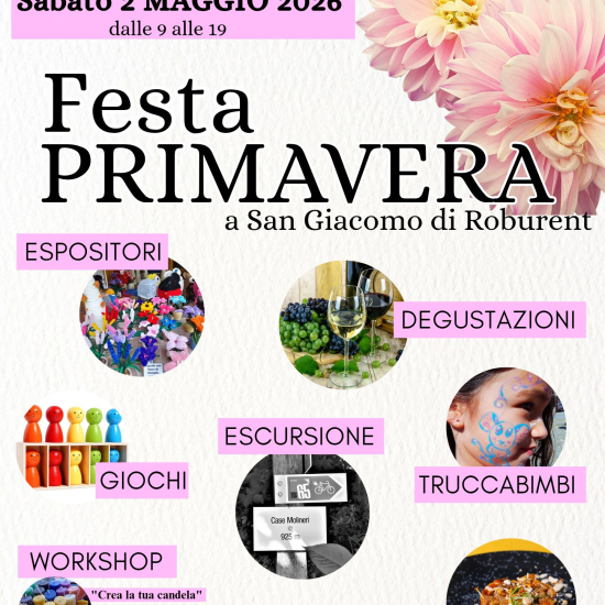 ENOGASTRONOMIA Periodo: 02/05/2026 Località: San Giacomo di Roburent Sabato 2 maggio la Pro Loco San Giacomo organizza la "Festa di Primavera" con eventi per grandi e piccini. Informazioni Pro Loco San Giacomo+39 335 660 0289prolocosangiacomo2022@gmail.com