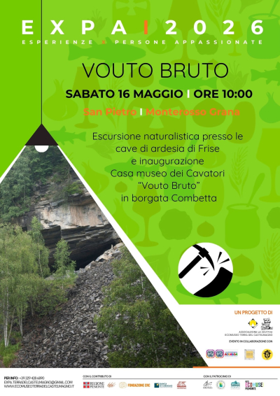 Sabato 16 maggio appuntamento con EXPA alle cave di ardesia di Frise, per un’escursione accompagnata che permetterà di ripercorrere la storia del territorio. Al termine della camminata sarà possibile partecipare all’inaugurazione della casa museo “Vouto Bruto”, dedicata ai cavatori, in Borgata Combetta. Il ritrovo è previsto alle ore 10 a San Pietro di Monterosso Grana, presso la sede dell'Ecomuseo Terra del Castelmagno. Per maggiori informazioni rivolgersi ai contatti riportati di seguito.