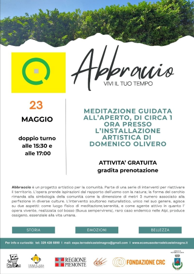 Sabato 23 maggio prosegue la rassegna “I sabati all’ecomuseo” con una meditazione guidata all’aperto presso l’installazione artistica “Abbraccio” di Domenico Olivero, a San Pietro di Monterosso Grana. L’incontro sarà condotto dall’artista e sarà dedicato a un momento di rilassamento e ascolto della natura e di sé. L’attività è gratuita e si svolge su due turni, dalle 15.30 alle 16.30 e dalle 17 alle 18. È gradita la prenotazione, rivolgersi ai contatti riportati di seguito.