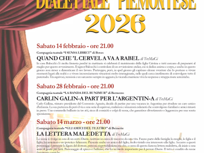 L’Assessorato alla Cultura della Città di Borgo San Dalmazzo presenta la Rassegna di Teatro Dialettale Piemontese 2026, in programma all’Auditorium Civico.