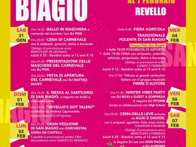I festeggiamenti di San Biagio e il carnevale a Revello si terranno dal 31 gennaio al 7 febbraio presso la nuova location del Pala San Biagio.