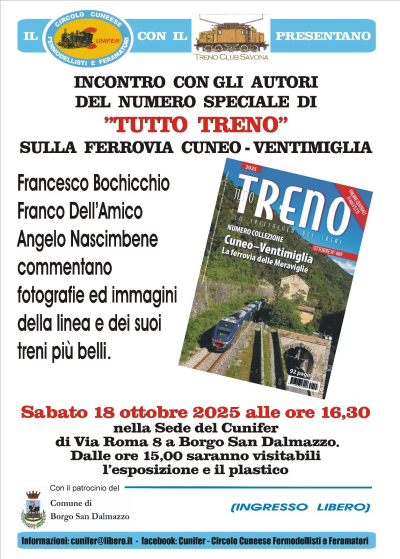 Un incontro con gli autori della rivista Tutto Treno che commenteranno le fotografie del numero di ottobre che verranno proiettate e racconteranno vicissitudini e accadimenti della linea ferroviaria Cuneo-Ventimiglia e dei suoi treni più belli, nel pomeriggio di sabato 18 ottobre nella sede Cunifer di via Roma 8 (ex mulino Gione) a Borgo San Dalmazzo.
