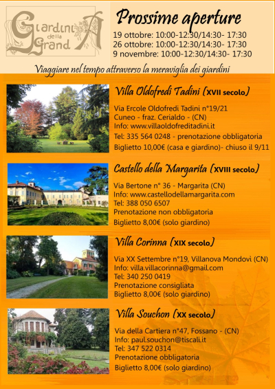 Il giardino storico di villa Souchon, a Fossano, è stato ideato e progettato nel 1929 dall'architetto Valabrega insieme al proprietario, Ing. Paul Souchon. Rispecchia la filosofia del giardini "après Le Notre" suddivisi in stanze con l'inserimento nella costruzione di elementi architettonici essenziali in stile Art Déco come l'architettura della casa. Il 19 e il 26 ottobre sarà possibile visitarlo, su prenotazione, con visita guidata in partenza ogni ora a partire dalle 10.00.
