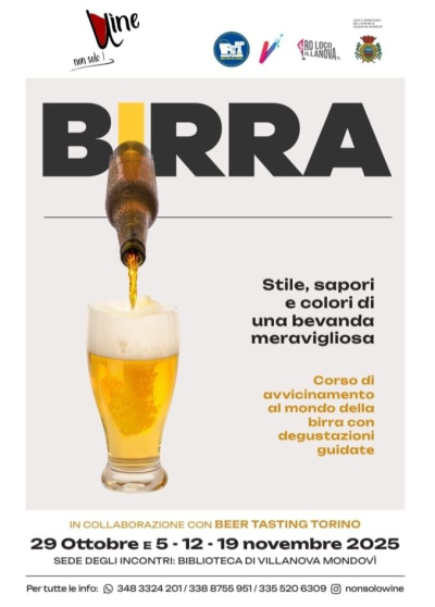 A partire dal 29 ottobre e per quattro mercoledì di fila (il 5, 12 e 19 novembre), la biblioteca comunale di Villanova Mondovì ospita 4 serate di degustazione a tema birra, con inizio alle ore 20. Prevista una degustazione di 5 birre a serata e i bicchieri a fine corso resteranno ai partecipanti. Attività su prenotazione.