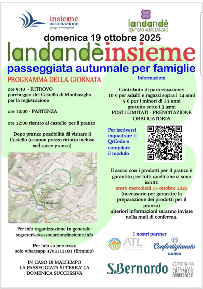 Siamo giunti anche quest'anno alla camminata per famiglie organizzata dal Gruppo Monregalese della Associazione Insieme, in collaborazione con il Comitato Landandè. Domenica 19 ottobre, con ritrovo al castello di Mombasiglio, dove faremo una breve, ma panoramica camminata adatta a tutti, a seguire, sacco pranzo preparato per i partecipanti prima della visita al Castello. Prenotazione consigliata.