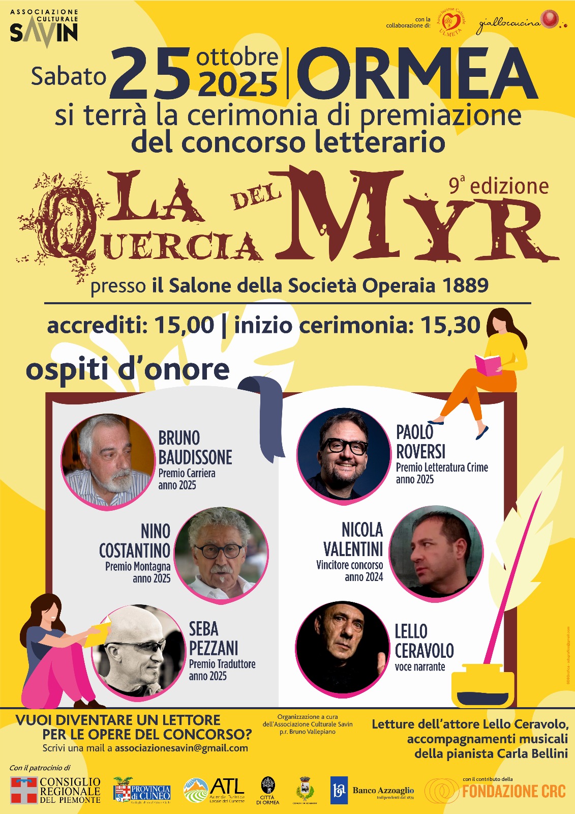 Sabato 25 ottobre nel Salone della Società Operaia si terrà la cerimonia di premiazione della 9ª edizione del concorso letterario “La Quercia del Myr”, promosso dall’Associazione Culturale Savin.
